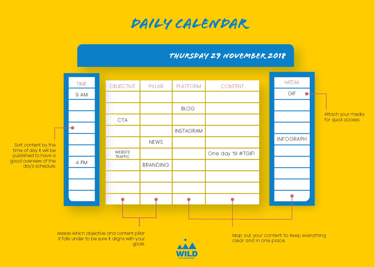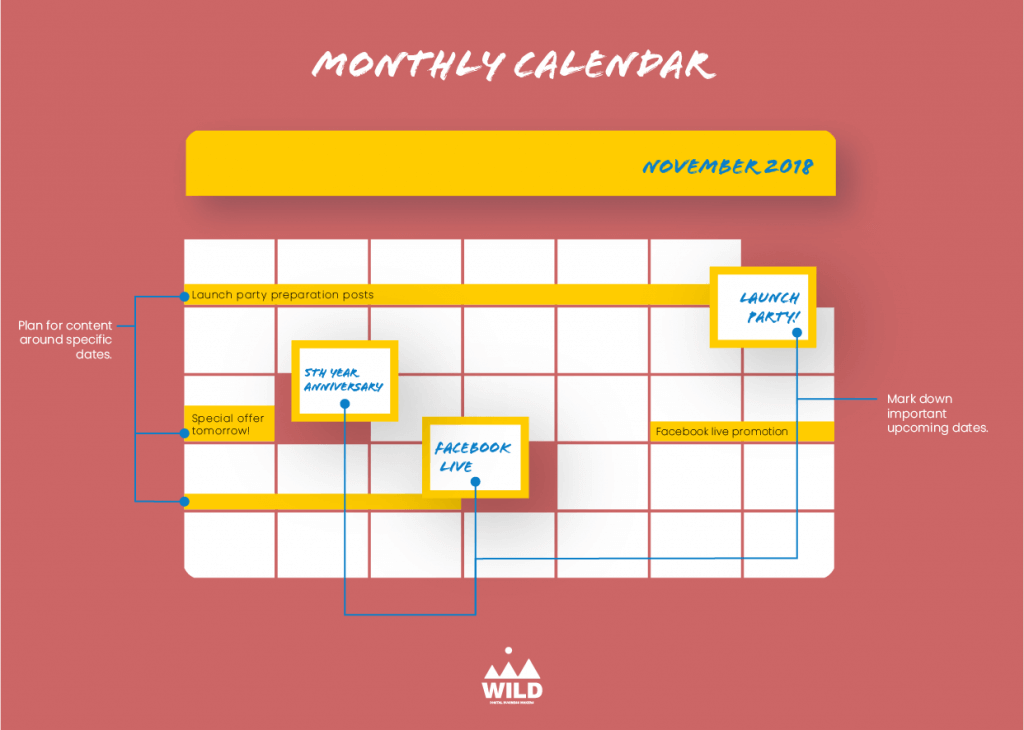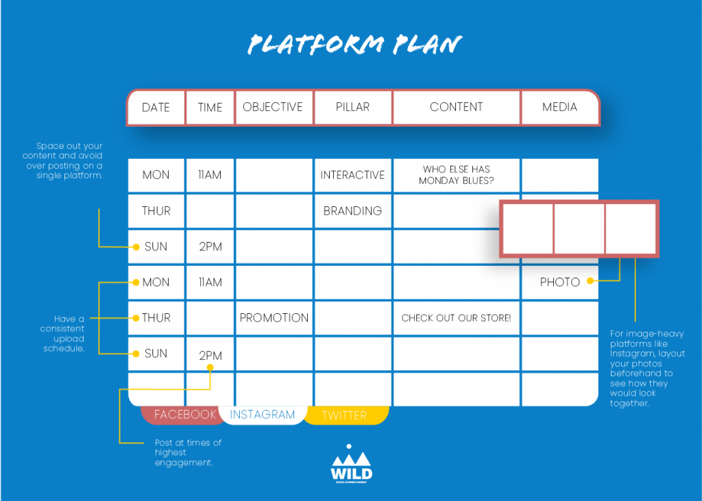 This is where all your posts will be organised by category and date, giving you a clear idea of when to post, publish, or send out your content. Below are some samples of clear plans: